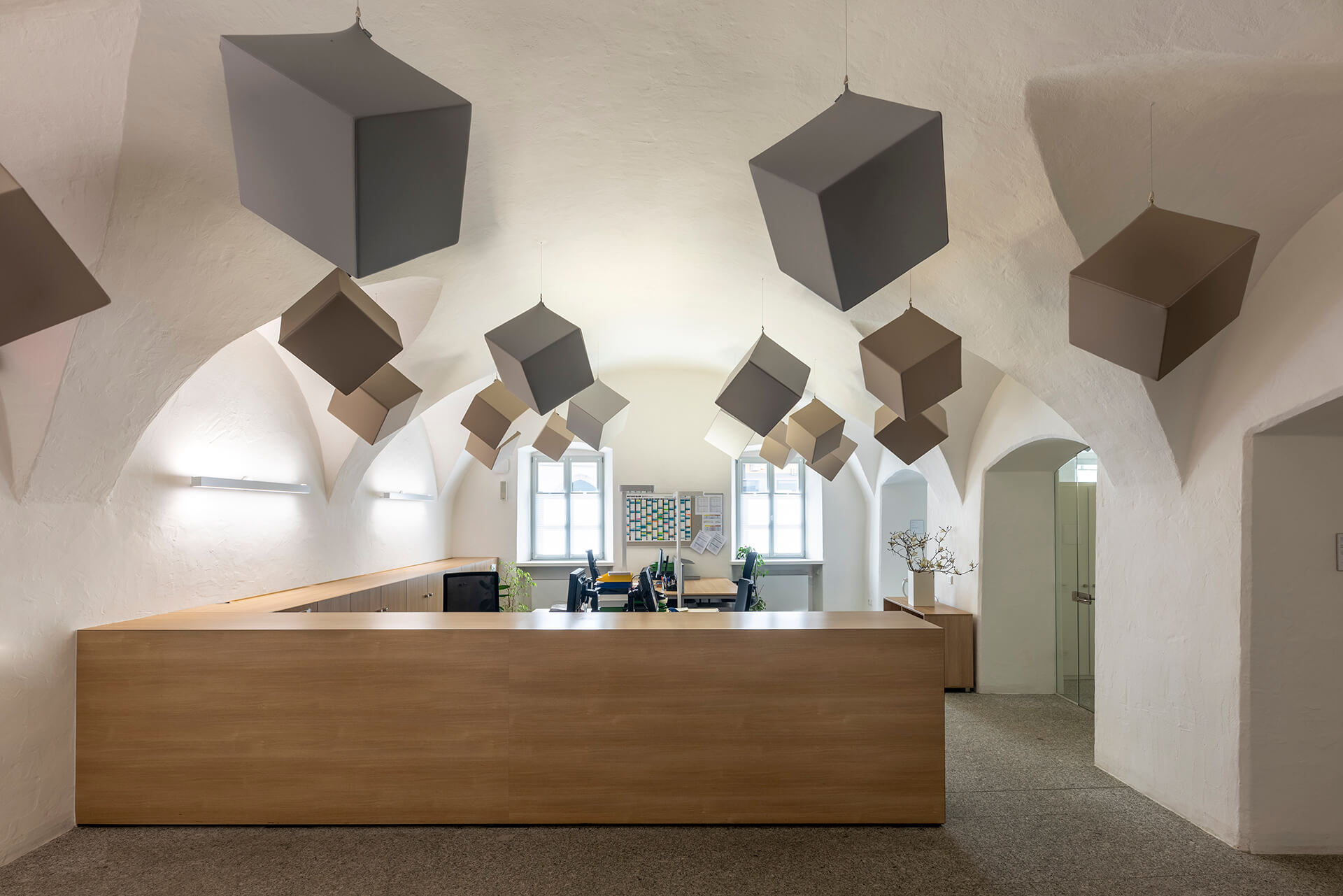 Pannelli a sospensione come Silente, Nuvola e Dot possono essere installati a soffitto con cavi regolabili, adattandosi alle irregolarità delle volte o inserendosi discretamente tra le travi a vista.