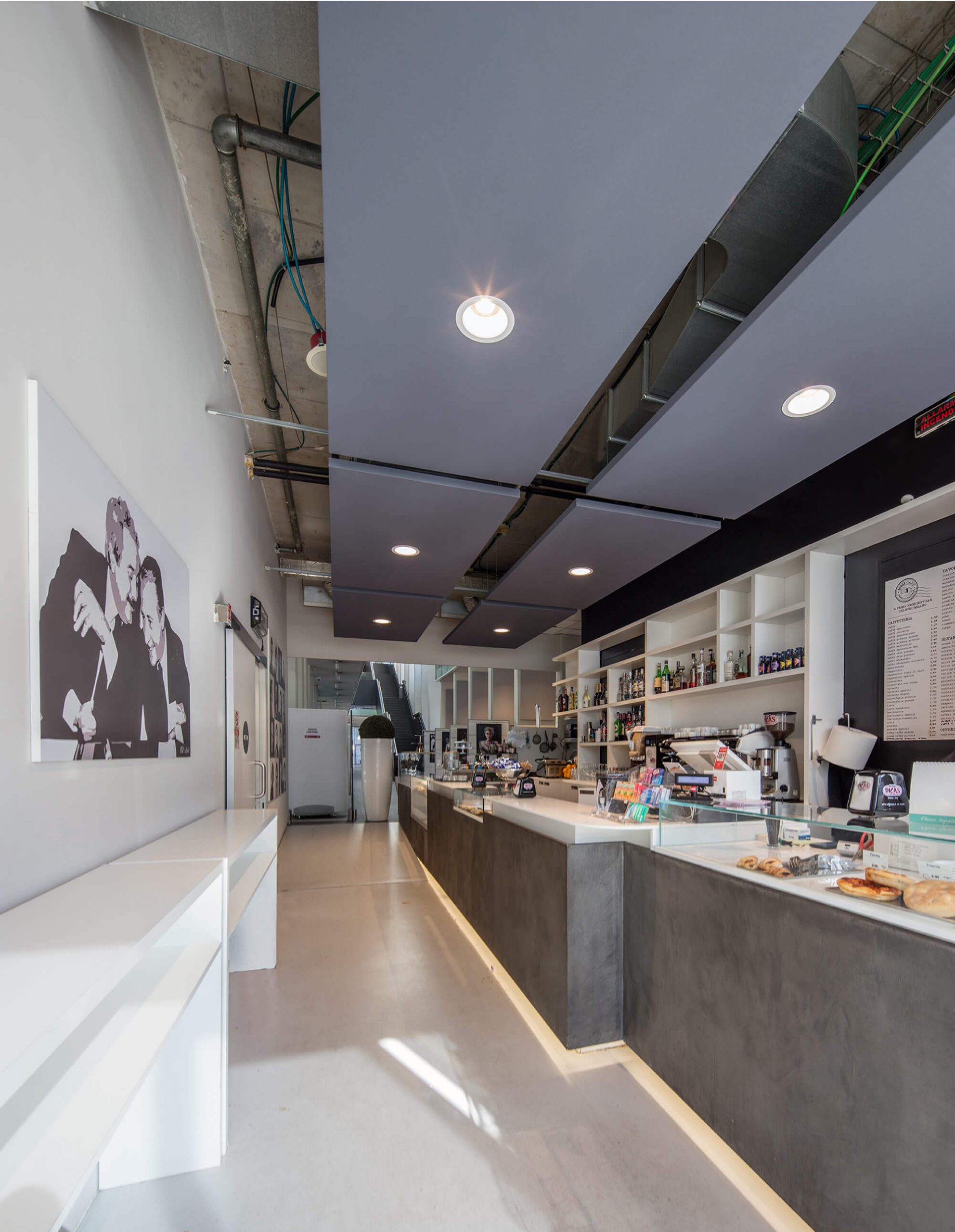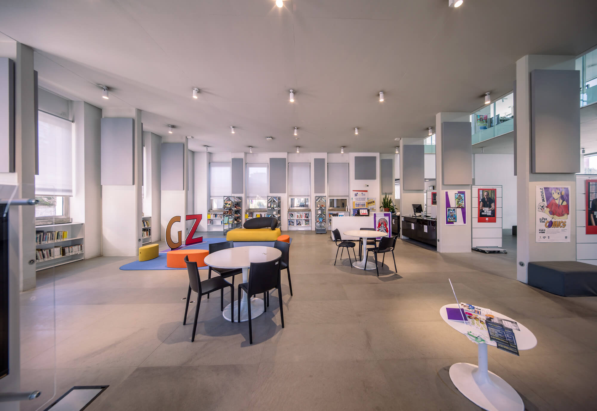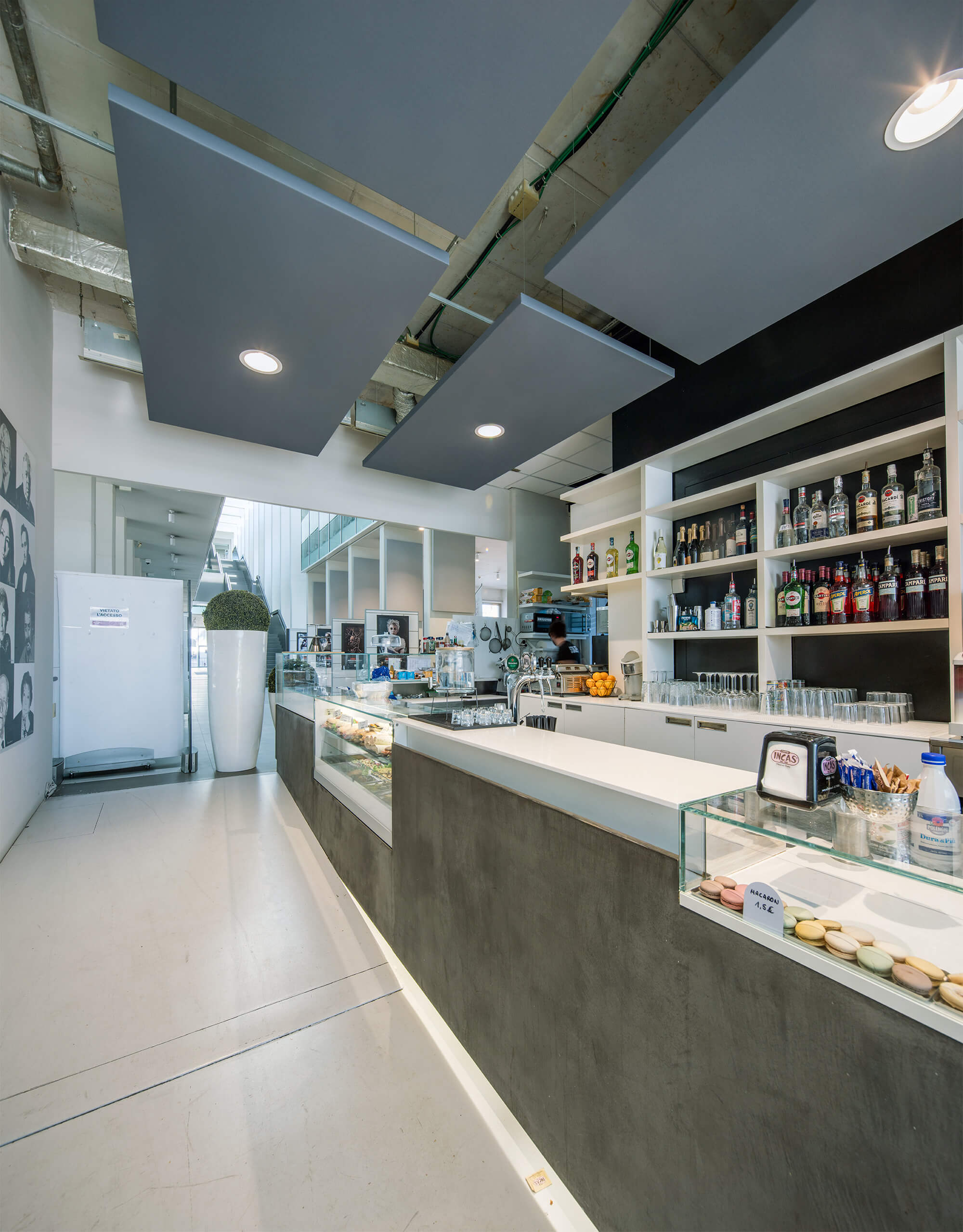 In the cafeteria, on the other hand, the project involved the installation of suspended Silente panels with integrated LED spotlights. This choice addresses the dual need to reduce background noise, typical of social spaces, while also incorporating a lighting solution. The result is a welcoming environment that is both functional and visually coherent with the contemporary style of the cultural centre.
