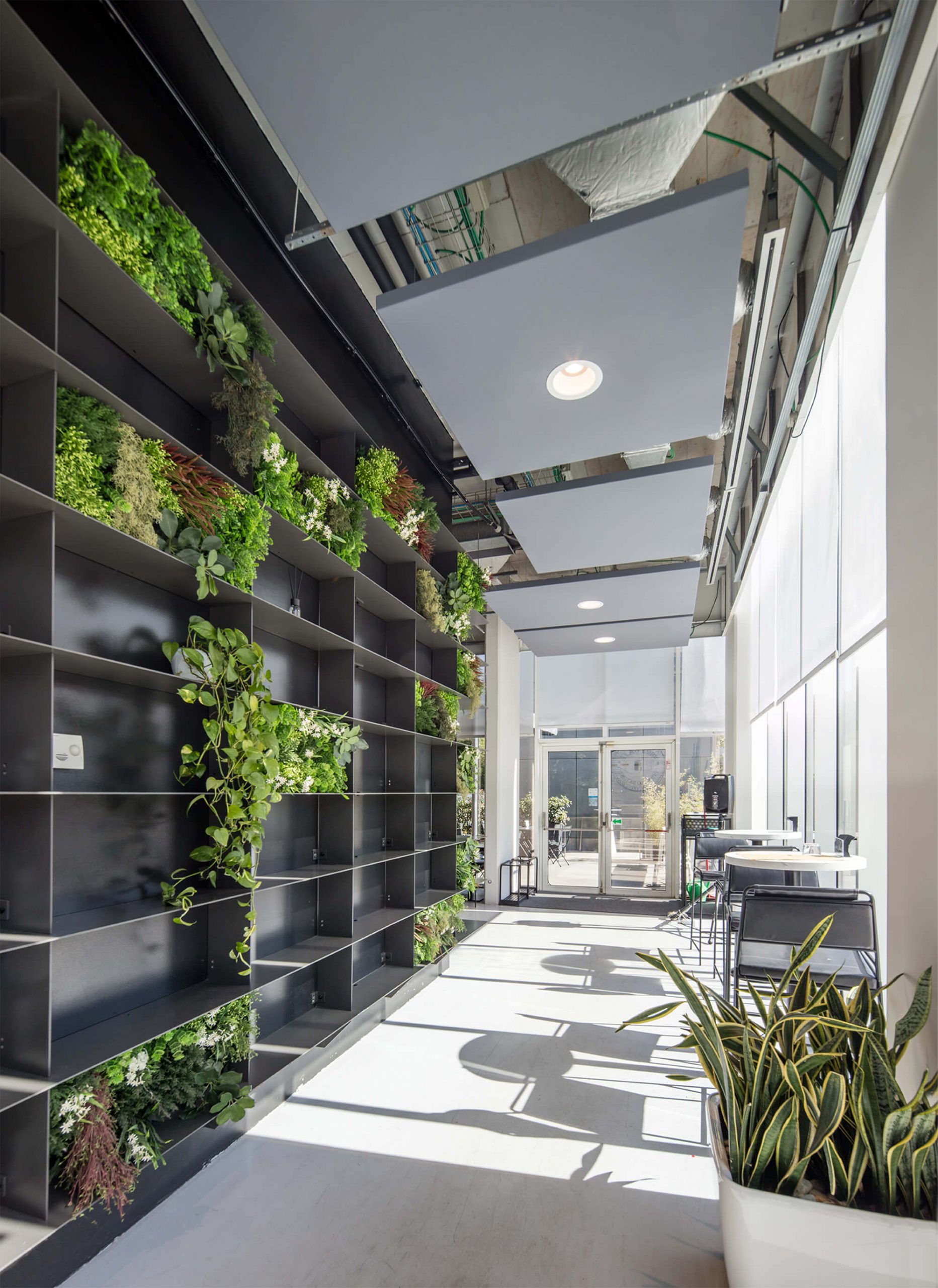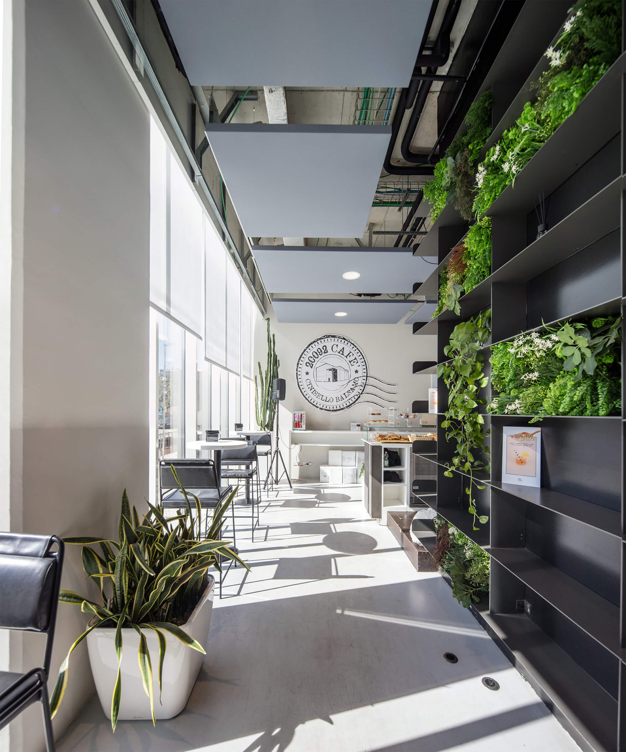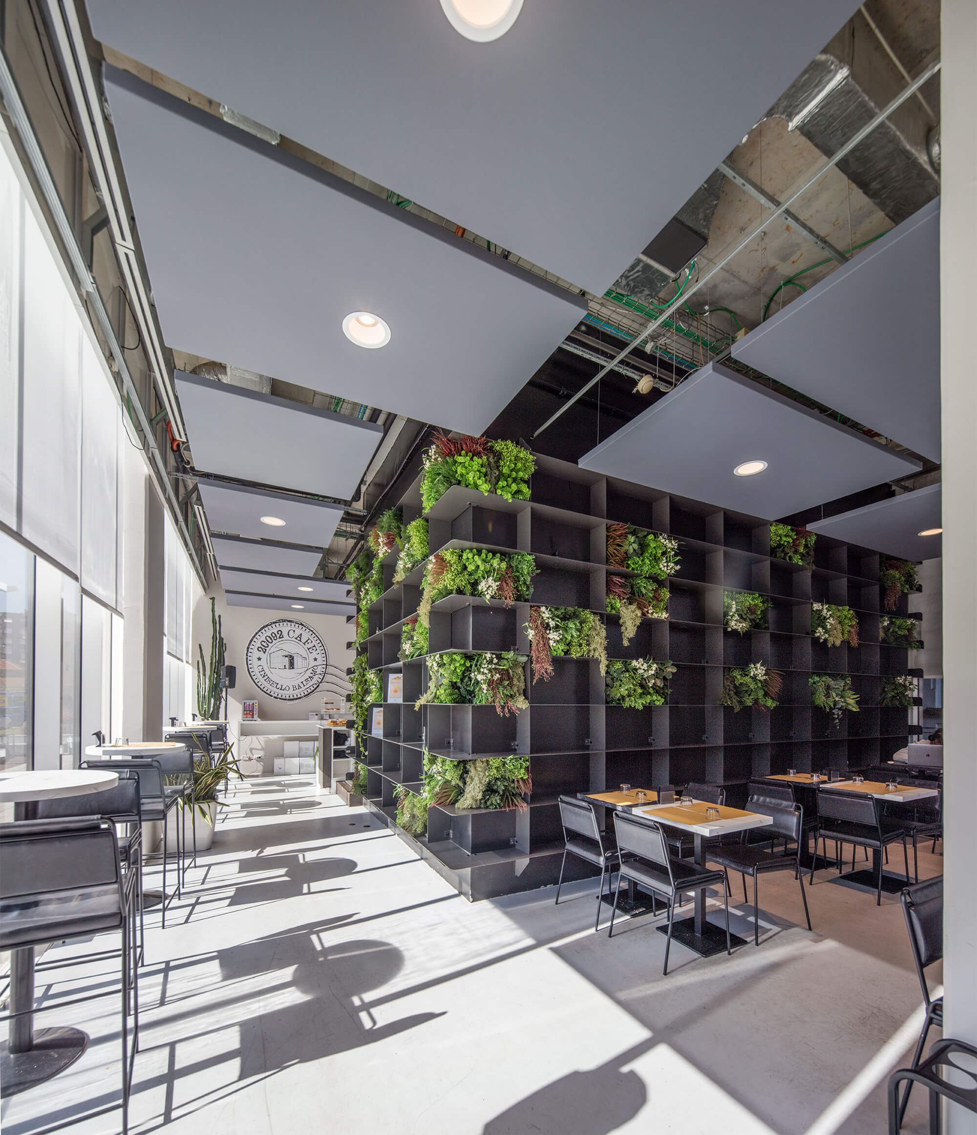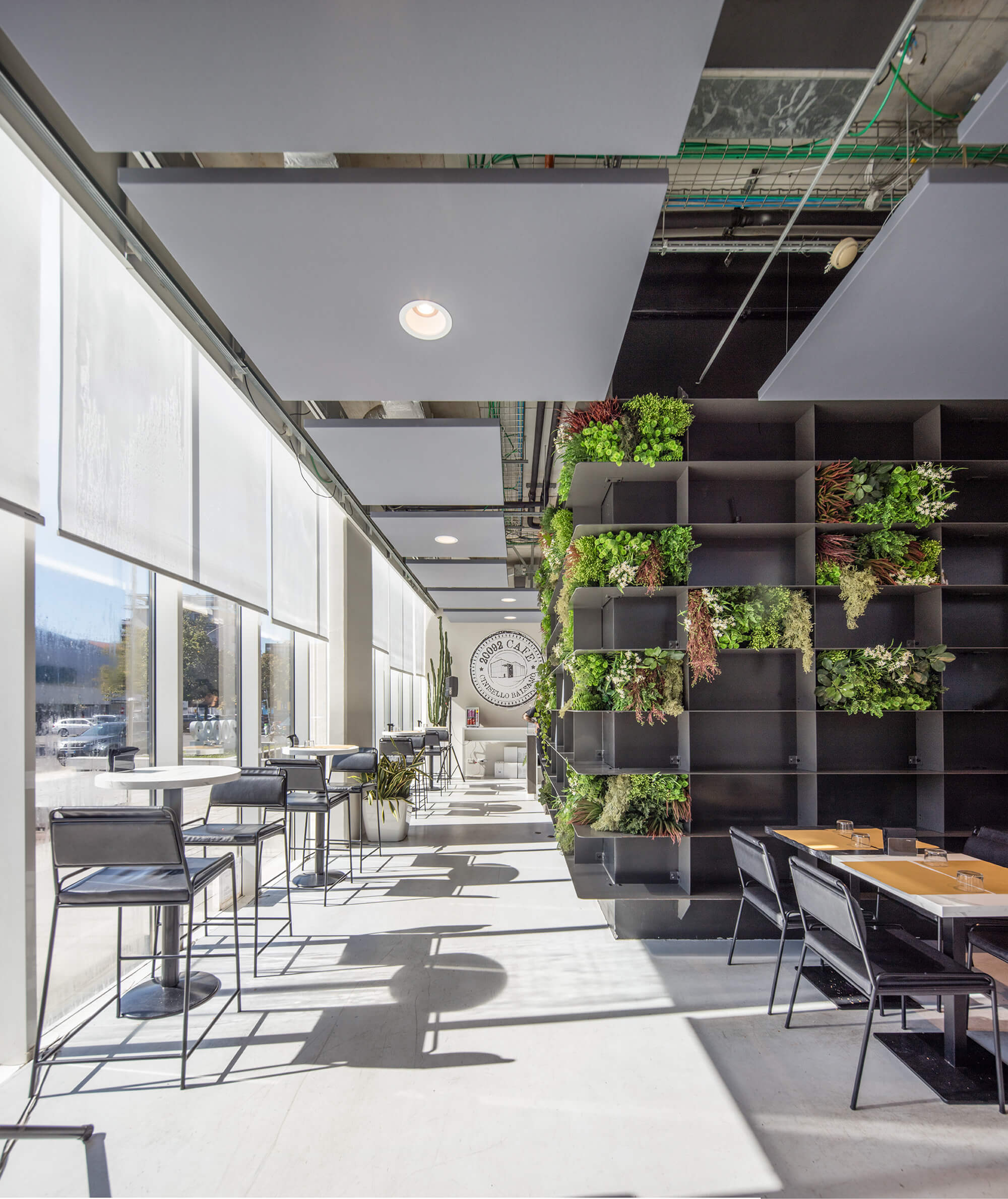 In the cafeteria, on the other hand, the project involved the installation of suspended Silente panels with integrated LED spotlights. This choice addresses the dual need to reduce background noise, typical of social spaces, while also incorporating a lighting solution. The result is a welcoming environment that is both functional and visually coherent with the contemporary style of the cultural centre.