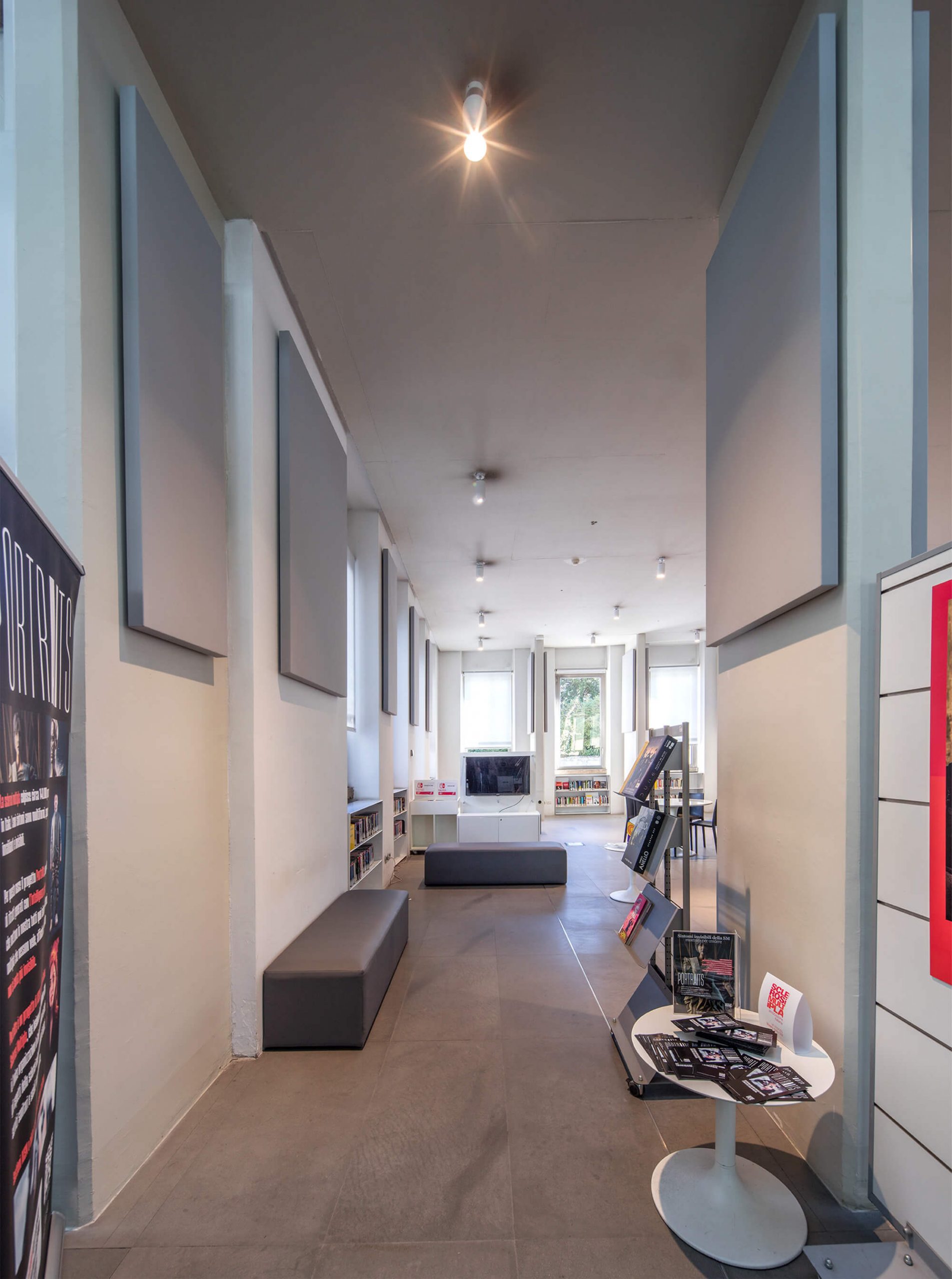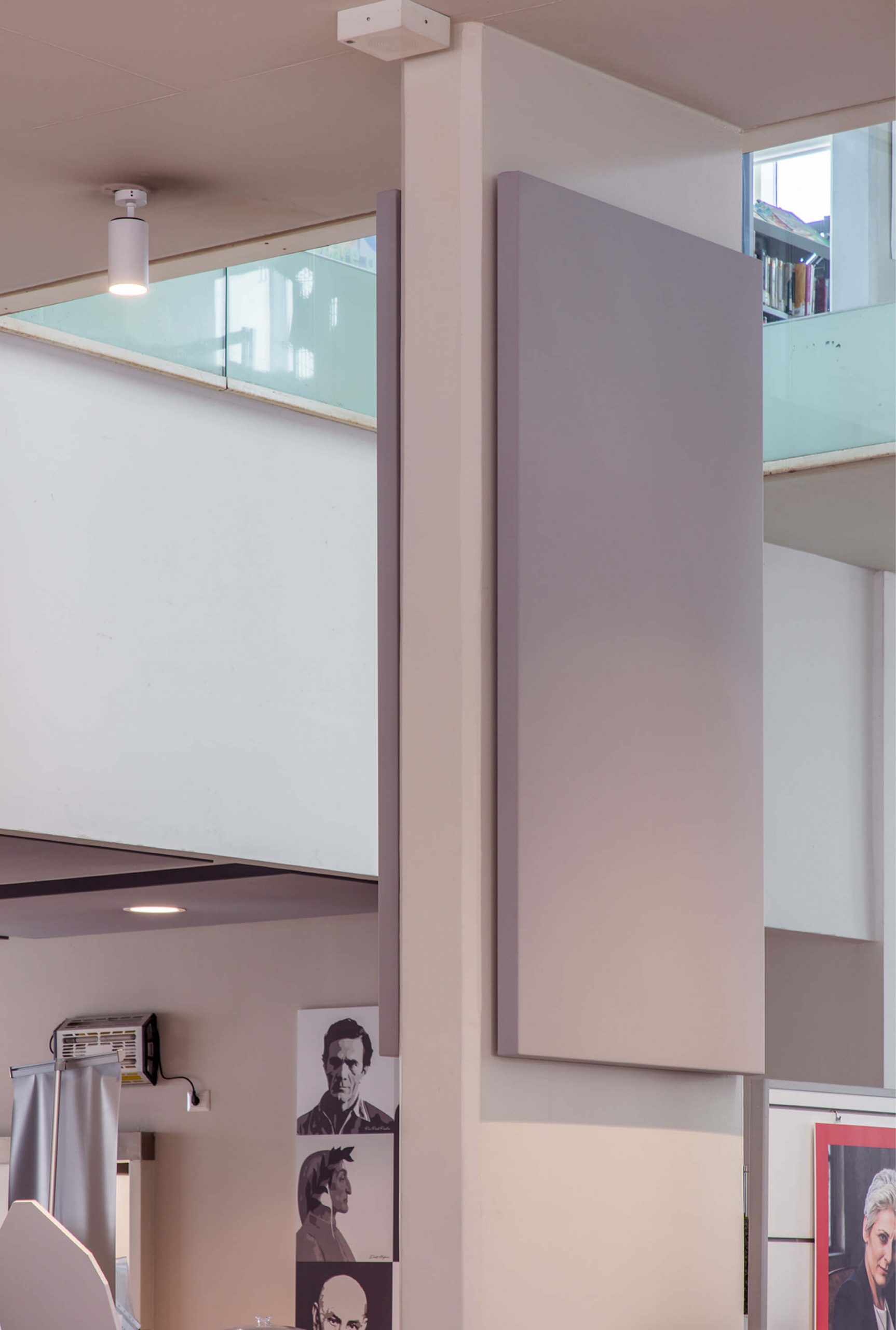 In the periodicals library, where focused reading and a quiet atmosphere are essential, Silente panels were installed flush-mounted on the walls. Covered in neutral grey fabric, the panels integrate discreetly into the room, ensuring effective reverberation control and fostering a calm and functional study environment.